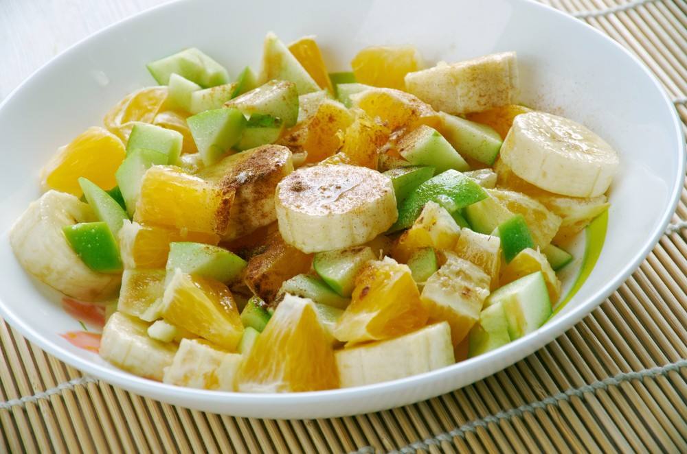 - يوضع الموز في بولة، ويضاف إليه التفاح والبرتقال، وتقلب جيداً.