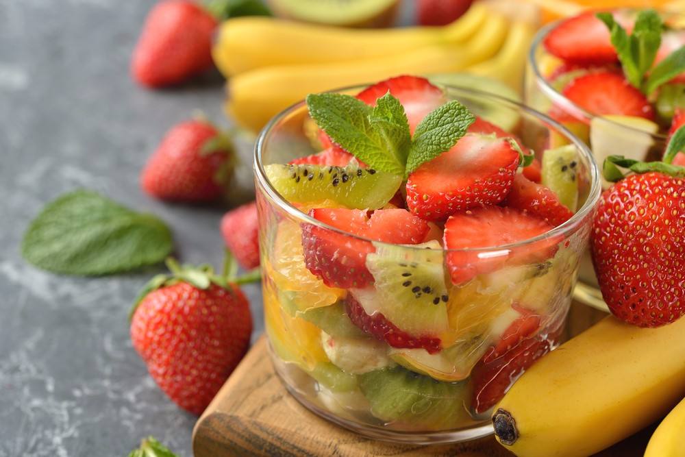 - يوضع الموز في بولة، ويضاف إليه الكيوي والتفاح والفراولة، ويقلب جيداً.