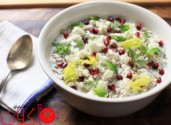سلطة القرنبيط بالزبادي ، طبق سلطة مغذي وصحي مع الأطباق الدسمة للتخفيف سعراتها الدهنية، ويتم تحضيره بالقرنبيط الطازج المفروم مع اللبن الزبادي والبصل والنعناع وحبات الرمان وزيت الزيتون على سطحه، ويمكنك تقديمه مع البقدونس والجبنة الفيتا أيضاً .