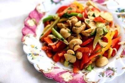 - نضيف الكوسة والجزر التي قمنا بطهيها على البخار لخليط المشروم ونقلب كل المكونات ثم نتبلها برشة من الريحان والتوابل زيت الزيتون وعصير الليمون