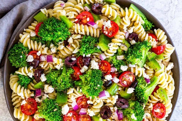 سلطة المكرونة اليونانية وصفة شهية ولذيذة وغنية بالعناصر الغذائية فهي عبارة عن معكرونة مسلوقة مع خضار مشكلة وزيتون وجبنة مع تتبيلة مميزة .