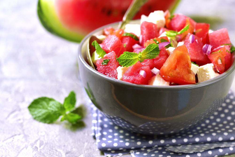 - يوضع البطيخ في بولة، ويضاف إليه الطماطم والفلفل، وتخلط جيدا.