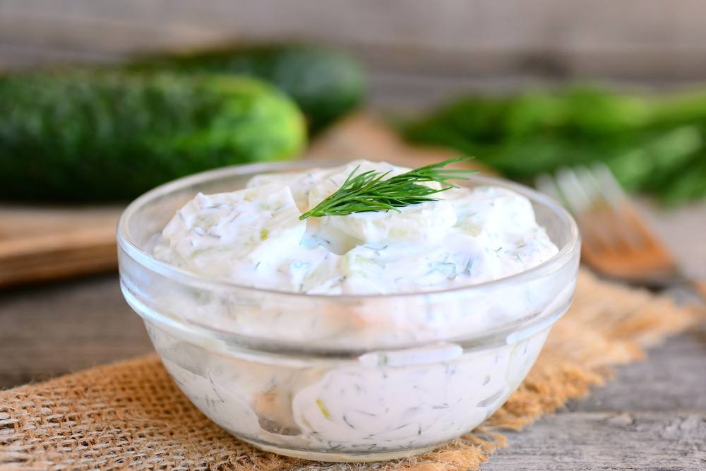 - يتبل الخليط بالملح والكمون، ويضاف إليه الخيار.