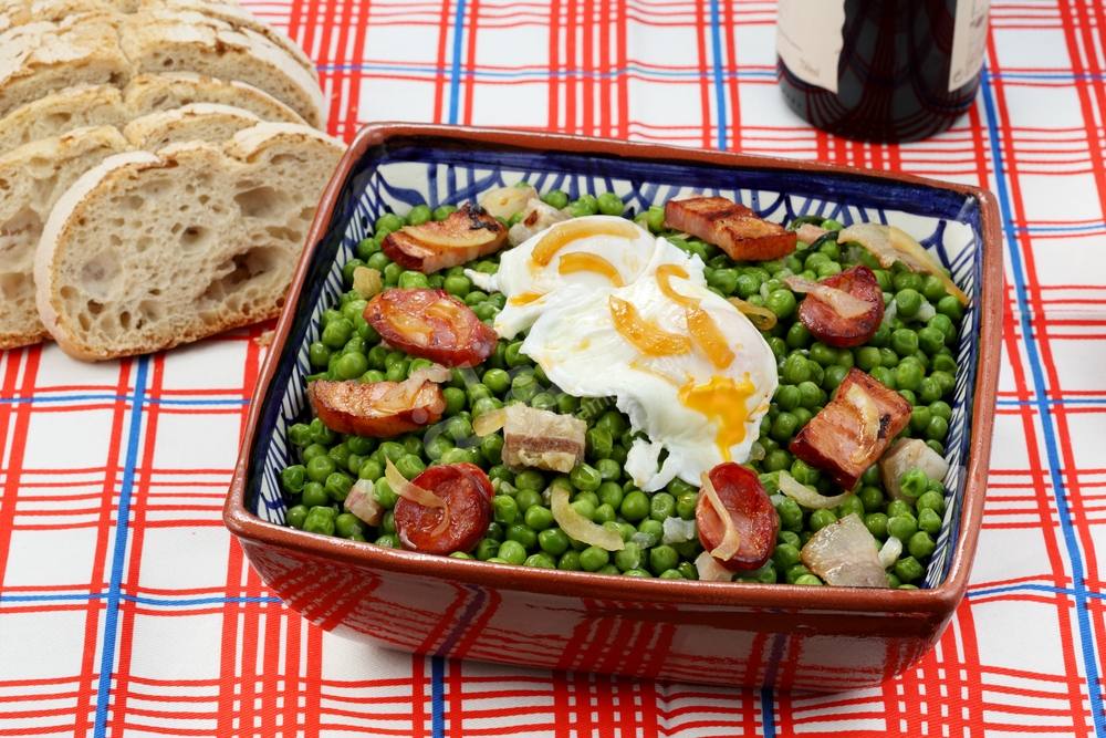 5. توضع البسلة مع السجق و البطاطس و باقي المكونات في طبق و تتبل بالملح و الفلفل و تقلب بخفة و تقدم .