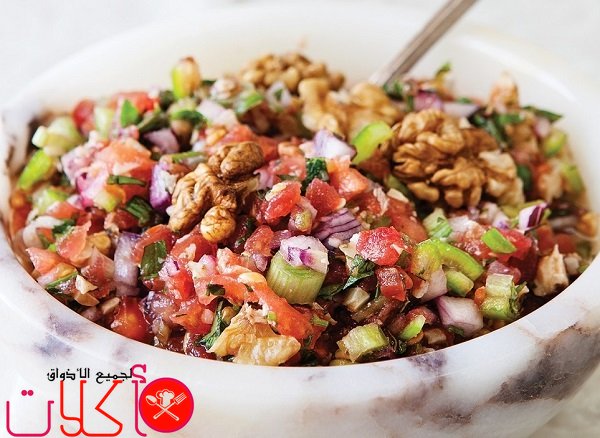 في هذه الوصفة سنقدم سلطة يمكن تقديمها إلى جانب جميع الوصفات أو يمكن تناولها كعشاء خفيف ولذيذ ومكوناتها عبارة عن طماطم وفلفل أخضر وبصل وبقدونس وجوز وصوص من السماق وزيت الزيتون ودبس الرمان حيث تقطع الخضار ويوضع فوقها الصوص وبذلك تكون جاهزة لتقدم إلى جانب أي طبق حسب الرغبة .