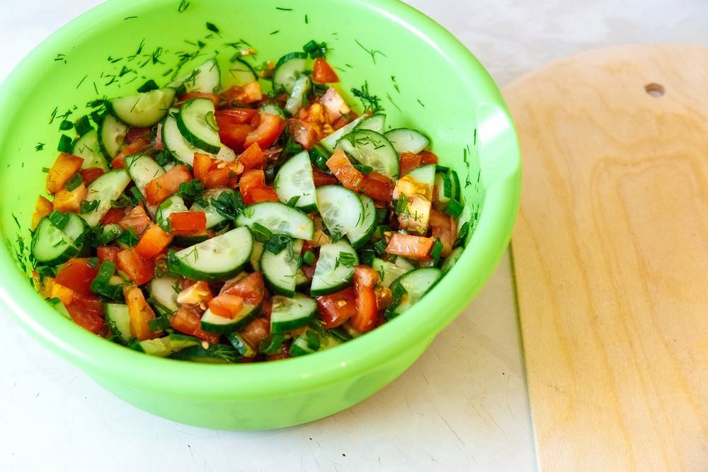 - توضع الطماطم في بولة، ويضاف إليها الخيار والبصل والشبت، وتخلط جيداً.