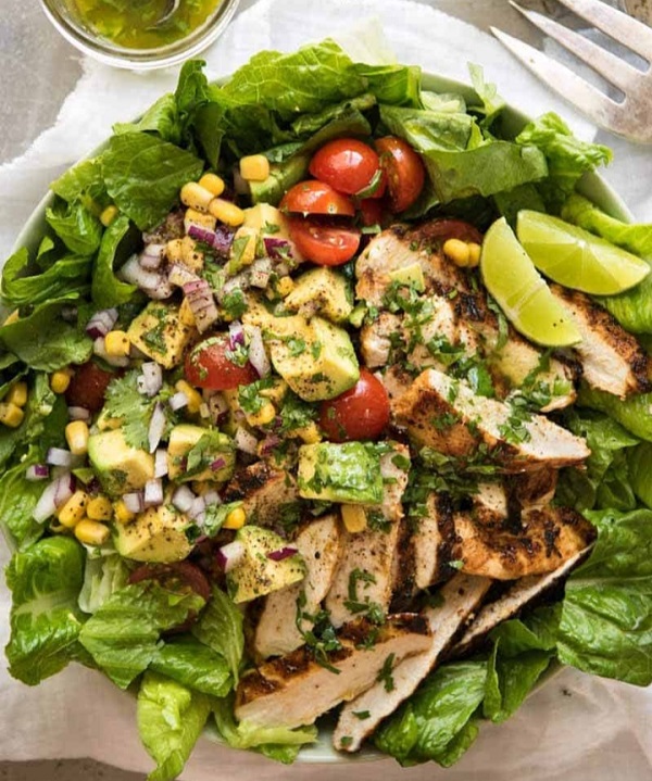 سلطة فيستا الدجاج وصفة غنية بالفوائد الغذائية خفيفة ومناسبة للرياضيين وللحميات الغذائية عبارة عن دجاج وخس وذرة وطماطم وأفوكادو مذاقها رائع .