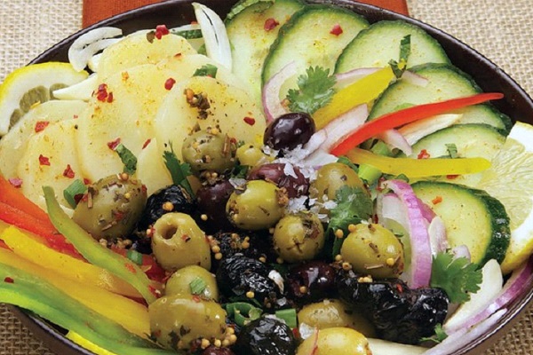 سلطة مغربية مشكلة مغذية وصحية ومناسبة للريجيم وهي تحتوي على أنواع مختلفة من الخضار مثل الخيار والفليفلة والليمون والبطاطس المسلوقة والبصل والثوم إضافة إلى الزيتون الأسود والأخضر مع تتبيلة الخل والليمون الشهية .