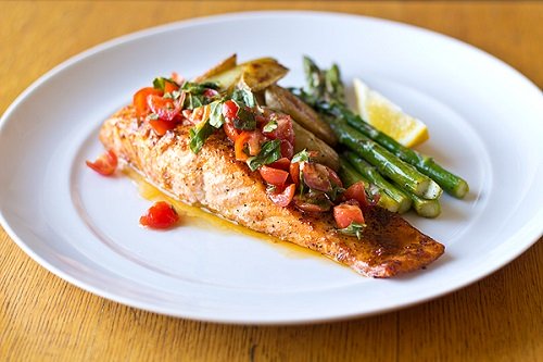 سلمون مشوي بالفرن مع البندورة طبق سمك سريع ومثالي لعشاء ليلة العطلة، يقدم مع طبق جانبي من السبانخ، سلطة الخضار أو طبق من البطاطا المقلية.