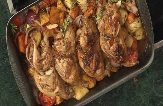 4. نقطع الخضار البطاطا والبطاطس والبصل والجزر مكعبات ثم نحمره في الزيت ونضع القليل من فصوص الثوم والروز ماري ونضعهم فوق السمان ونتركه قليلا ثم نضعه في طاجن فرن .