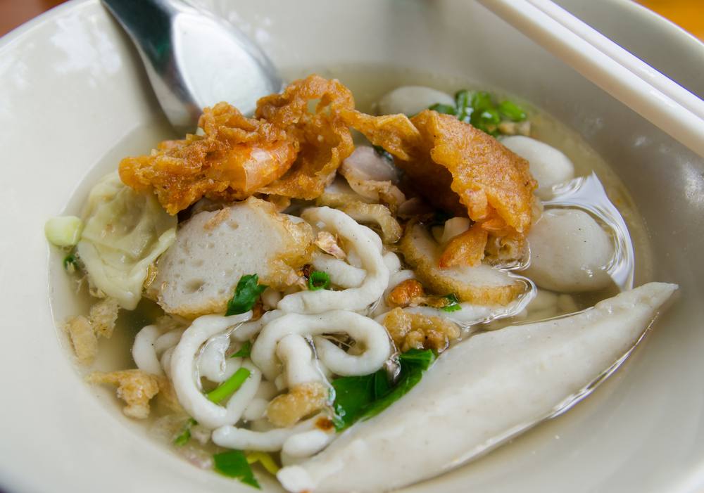 تقسيم النودلز بين الأطباق و يوضع عليها خليط السمك و صلصة و ينثر عليها الكزبرة و يقدم مع شرائح الليمون .