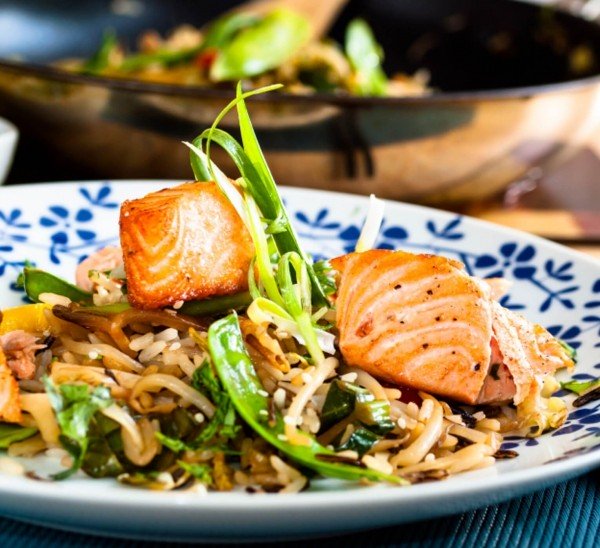 طريقة عمل سمك سلمون كوجبة غنية بأوميغا 3، الدهون، البروتين، وألياف الخضار، وبنفس الوقت بسيطة وسهلة التحضير، تتكون من مكعبات سمك السلمون، مع تشكيلة متنوعة من الخضار كالفطر، البروكلي، الفليفلة، الزنجبيل، ثم يرش فوقهم بذور السمسم، ويقدم الطبق ساخناً مع الأرز أو البطاطا وسلطة للخضار.