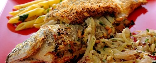 8. يقدم سمك محشي بالبقسماط والبصل دافئا مع معكرونة او أرز “حسب الرغبة” وقليل من خليط البصل والشمر