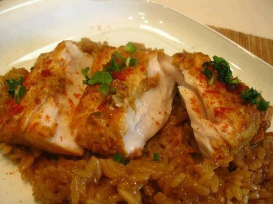 - يقدم الطبق بحيث يفرد الارز ويصف فوقه السمك ويرش بكزبرة او بقدونس مفروم ورشة من بودرة الفلفل الاحمر الحار وبالقرب منه الصلصة .