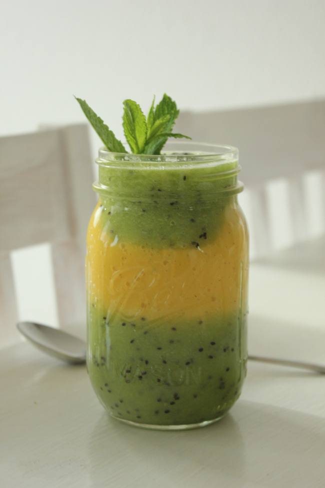 1. إمزجى الكيوي مع نصف الموز وبعض أوراق النعناع والنصف الآخر مع المانجو والفانيليا .