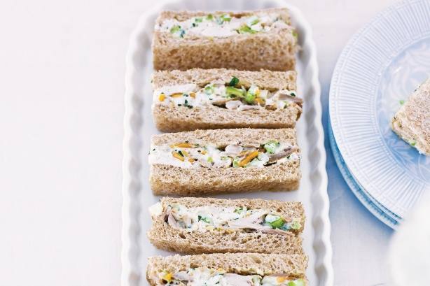 ترص نصف شرائح الخبز على سطح عمل نظيف ويفرد عليه خليط الدجاج بالتساوي ويوضع عليها باقي شرائح الخبز وإستخدام سكين مسننة نزيل القشور من كل شطيرة ويقطع كل سندويتش بالطول إلى ثلثين وترص على طبق التقديم .