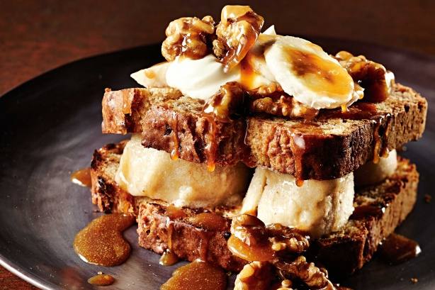 - يقطع خبز الموز شرائح سُمكها 1 سم ويحمص قليلاً وتوضع شريحة على كل طبق ويوضع عليها بولة آيس كريم ثم شريحة أخرى من الخبز و يوضع عليها بولة قشدة حامضة و شرائح الموز و الجوز و يسخن صوص الكراميل على نار هادئة حتى يسيل وتصب فوق السندويشات.