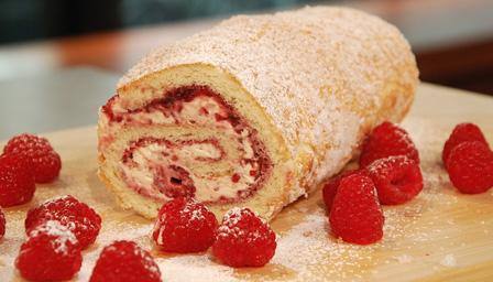 12 دقيقة . - نخرجها من الفرن ونضع الحشو بالداخل ونلف السويسرول ثم إضغطي عليها جيداً ثم