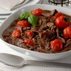 ٤. توضع صينية قلي أو مقلاة مستديرة ذات قاعدة سميكة على حرارة مرتفعة؛ وتُقسم كمية اللحم إلى 4 كميات متساوية. تُقلّى الدفعة الأولى لمدة 20 ثانية مع تقليبها على النار؛ يُضاف إليها ربع كمية الطماطم مع رشة صغيرة من الخل وتُقلّى لمدة 10 ثوانٍ إضافية. يوضع المزيج في طبق مقاوم لحرارة الفرن ويُغطّى بورق الألمنيوم ويوضع جانباً.