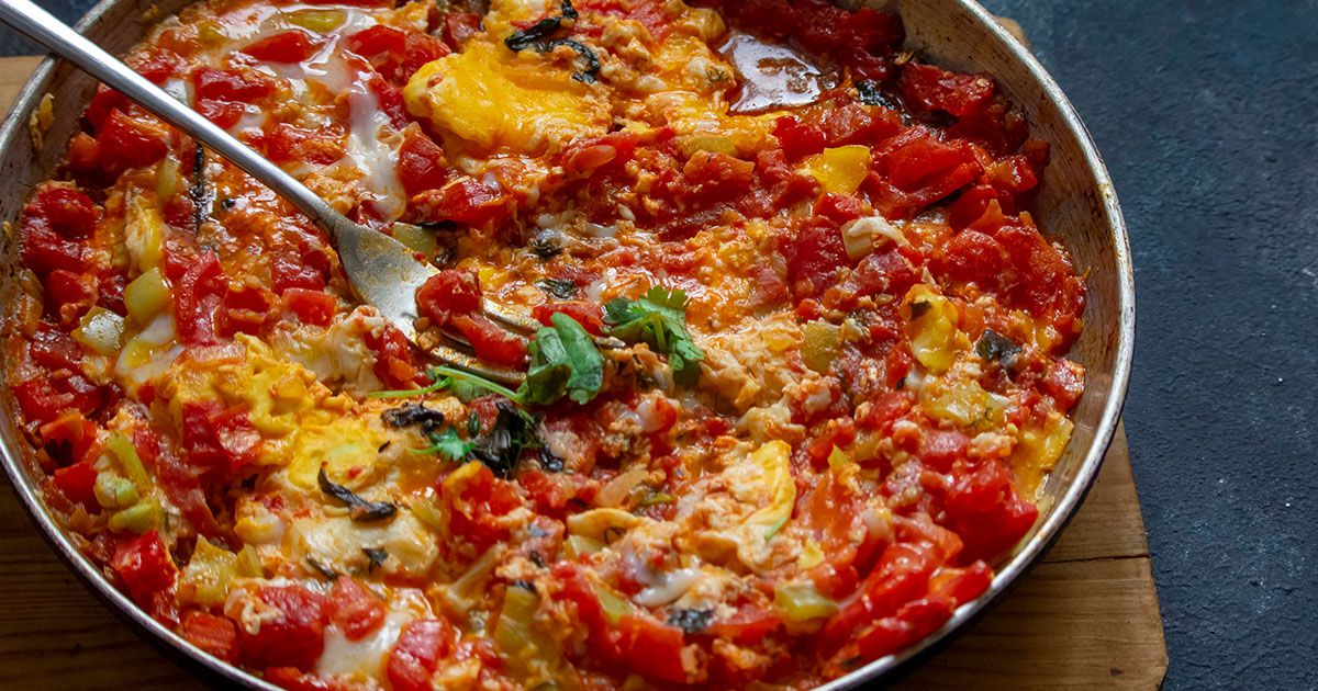 3- أكسري البيض فوق المزيج وقلّبي المكونات حتى تتداخل وينضج البيض.