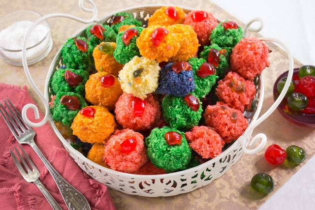- ثم تقطع بالقمع او تكور باليد يضاف اليها الكريز او الفواكة المسكرة .