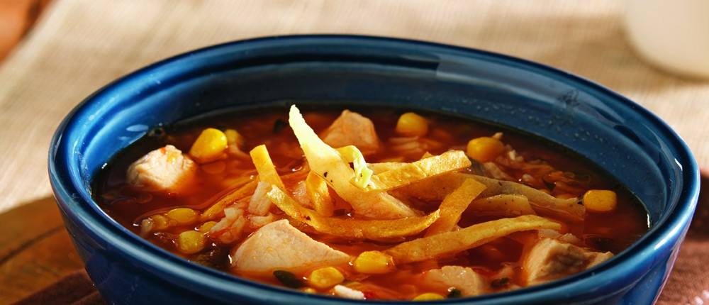 - ضعي الشوربة في بولات التقديم ثم زينيها بقطع التورتيللا المحمصة.