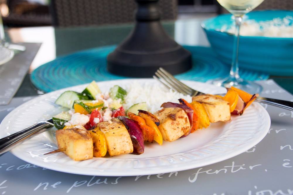 - ترص مكعبات التوفو في الأسياخ ويوضع فوقها قطع البصل والفلفل الأحمر والأصفر.