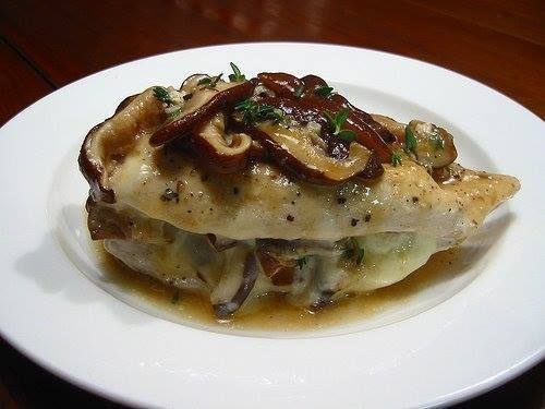 - يفتح صدر الدجاج، ويحشى بخليط لحم العجل والفطر والبصل، ويطهى لحوالي 15 دقيقة.