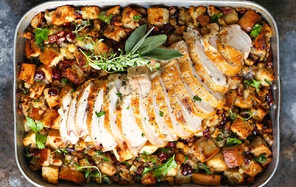 4. نضيف الخبز وحشوة خبز الذرة والجوز وملح وفلفل ونحرك ثم نضيف مرق الدجاج ونترك المكونات جانباً حتى يتم امتصاص المرق .
