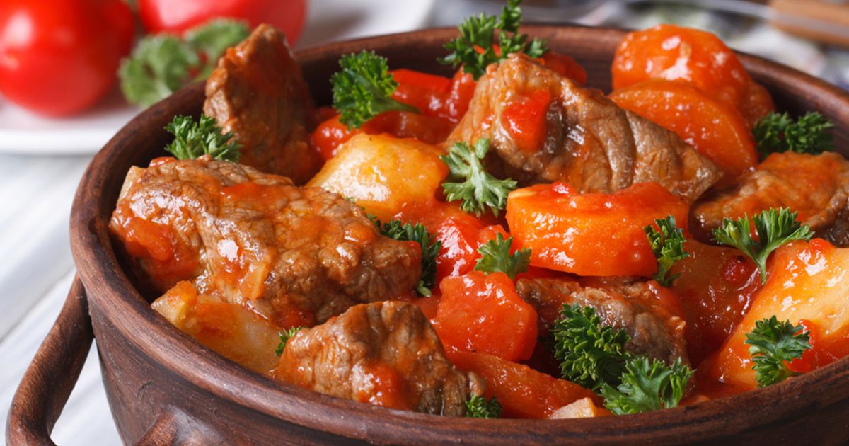 3- في صينية فرن، ضعي البصل ثم نكّهي بالملح والفلفل الأسود. أضيفي البطاطس واللحم. زيدي صلصة الطماطم، المرق والسمن. أضيفي شرائح الطماطم.