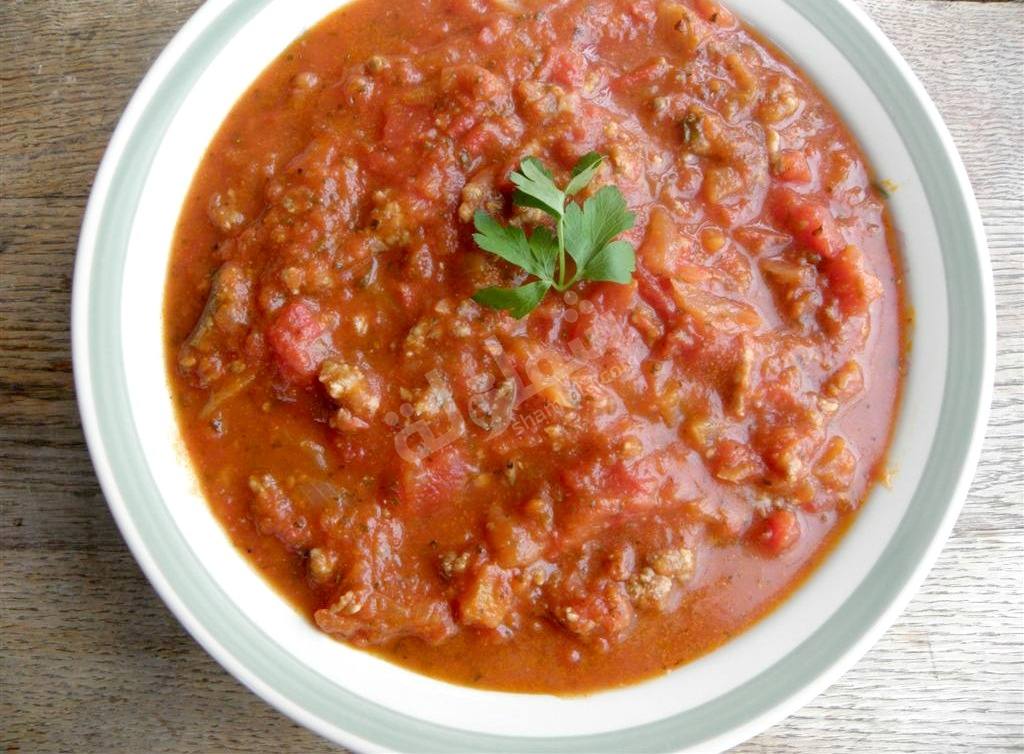 - تضاف اللحمة المفرومة، وعصير الطماطم، والبقدونس وتقلب مرة أخرى.