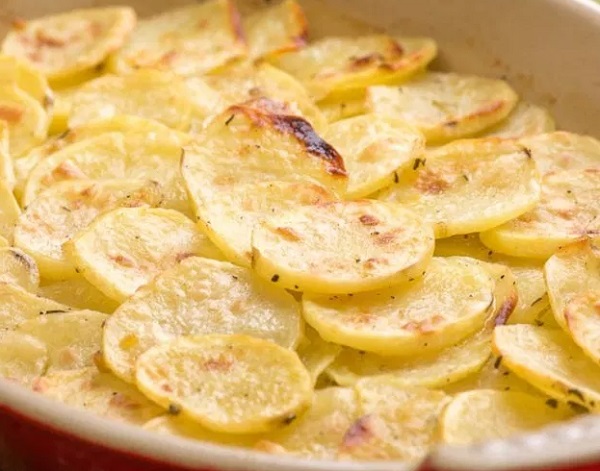 - نضع البطاطس و البصل بعد التتبيل في طبق بيركس أو في صينية الفرن