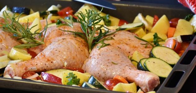 - إخراج الصينية من الفرن، ثمّ نزع ورق الألمينوم، وإضافة صدور الدجاج إلى الخضار.