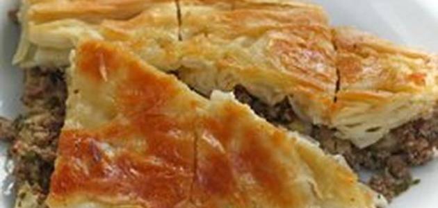 - يُوزّع اللحم المطهي، وتكرّر هذه الخطوة لبقية الرقاقات مع وضع مقدار ملعقة كبيرة من السمن بين كل رقاقة وأخرى.