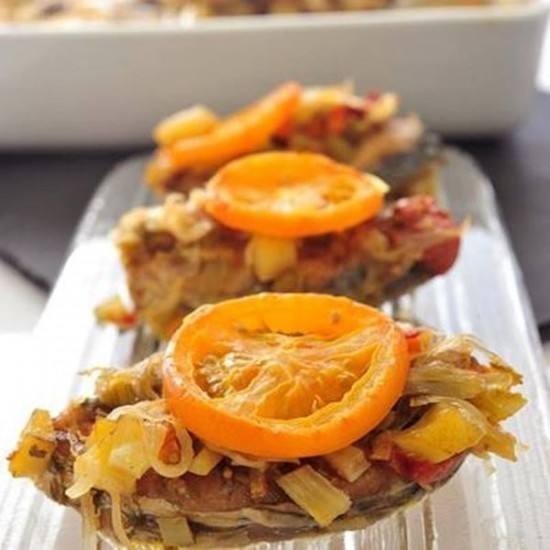 - يوضع نصف مقدار خليط الخضروات في صينية فرن، ثم تُرص حلقات السمك ثم تُوزع طبقة أخرى من الكمية المتبقية من خليط الخضروات، ثم طبقة أخيرة من البصل المحمر.