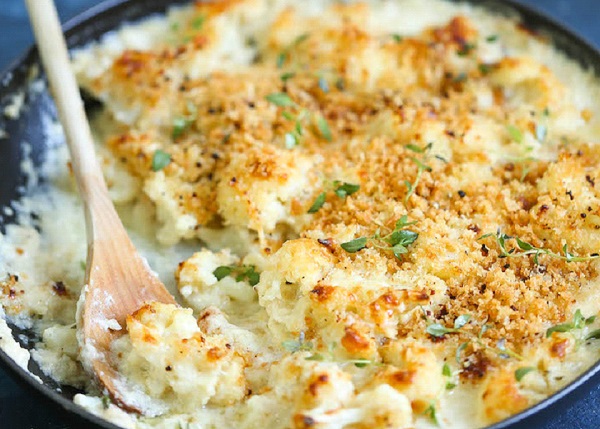 5. نضيف القرنبيط فوق الصلصة مع الموزاريلا وما تبقى من برش البارميزان ونحرك لمدة دقيقتين حتى تذوب الجبنة ثم نرش مزيج فتات الخبز ونضع المكونات في الفرن لمدة 20-25 دقيقة .