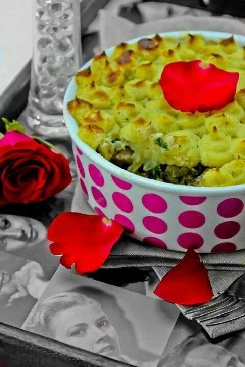 5. اسكبي الكبدة في قالب فرن وغطي الكبدة بوردات البطاطس .
