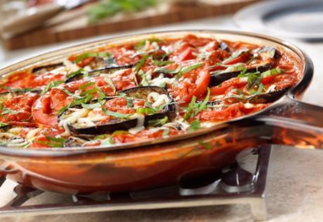 10. يوضع نصف كمية الخليط في صينية او قالب بايركس، ويرص فوقه شرائح الباذنجان.
