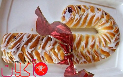 10- نخرج الضفيرة من الفرن ونتركها لتبرد ثم نزينها بالصوص الأبيض ويمكن وضع شريط ساتان للزينة وتصبح جاهزة للتقديم