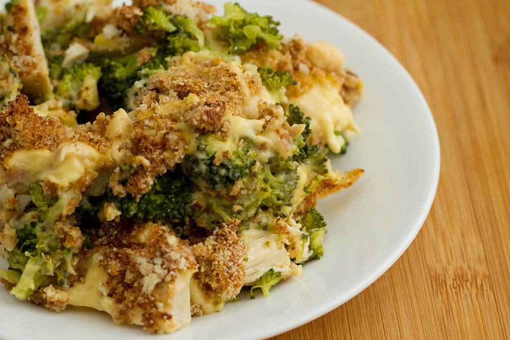 - في بولة كبيرة الحجم ضعي الشوربة و اللبن و قلبي جيدا ثم ضعي المزيج على البروكلي و الدجاج ثم ضعي الجبن الشيدر على الوجه.