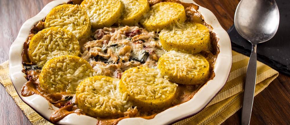 - ضعي مزيج الدجاج و السبانخ في الصينية ثم ضعي عليه حلقات الكوسة ثم ضعي الجبن البارميزان المبشور.