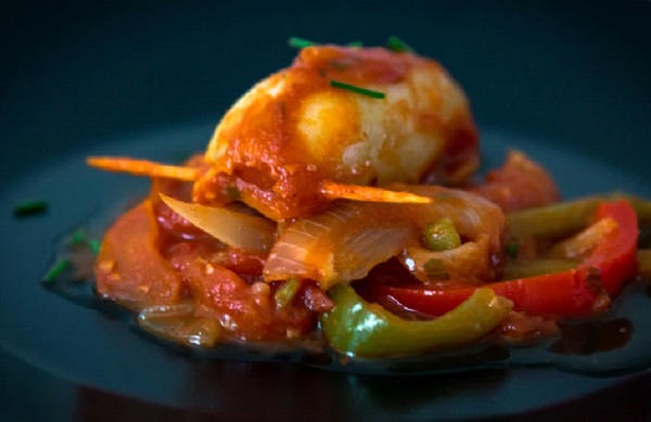 - نملأ قطع السبيط بالحشوة ونغلقها بالأعواد الخشبية بإحكام ثم نضعها في صلصة الطماطم والفلفل ونتركها على نار متوسطة لمدة 25 دقيقة ثم نغطيها ونتركها على نار هادئة لمدة 20 دقيقة .