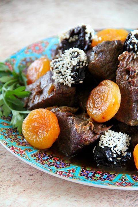 - مررّي البرقوق فقط في السمسم، ثم زيني اللحم بالبرقوق والمشمش.
