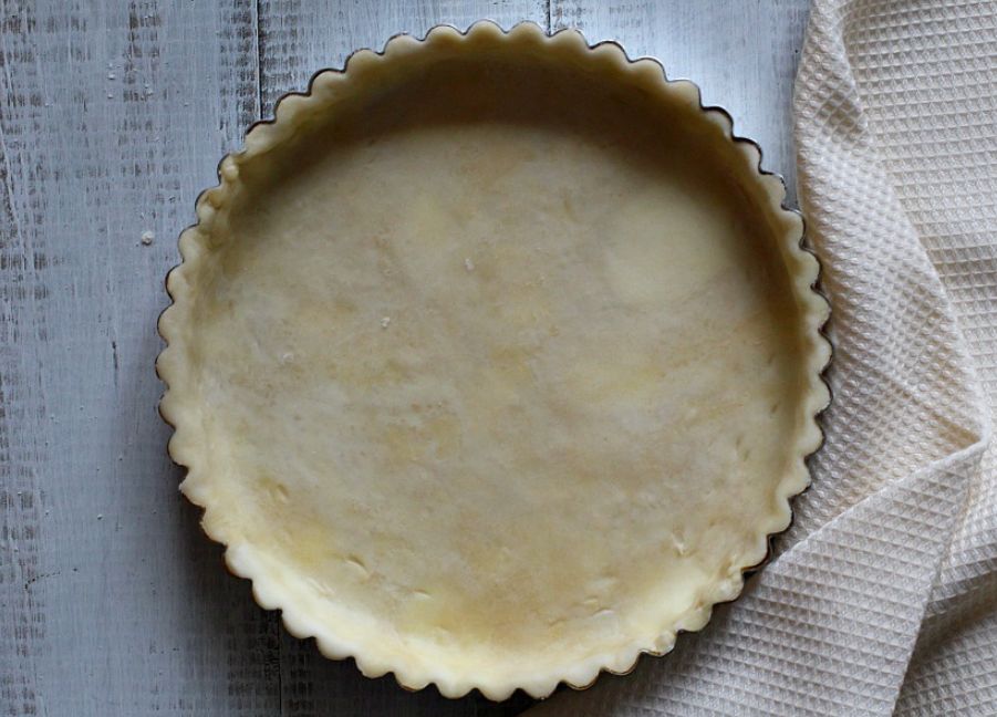 - نخرجها من البراد وندهن قالب التارت بالقليل من الزبدة ومن ثم نمد العجينة في القالب، ونعيد تغطيها بالنايلون (هذه المرة وهي ممدودة في القالب) ونعيدها إلى البراد حوالي 15 دقيقة.
