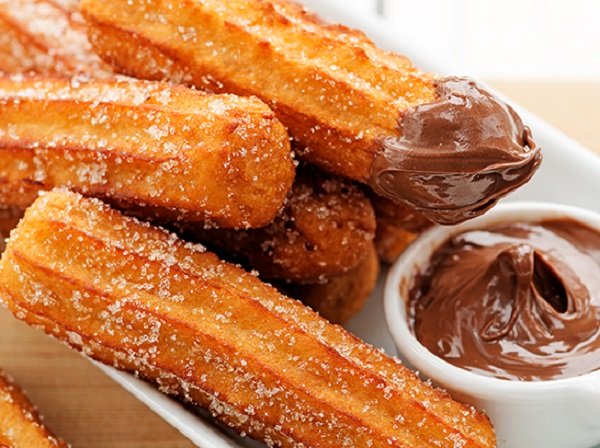 - نزين اصابع الشورو بالسكر والقرفة حسب الذوق وإلى جانبها صوص الشوكولا لتكون جاهزة للتقديم .