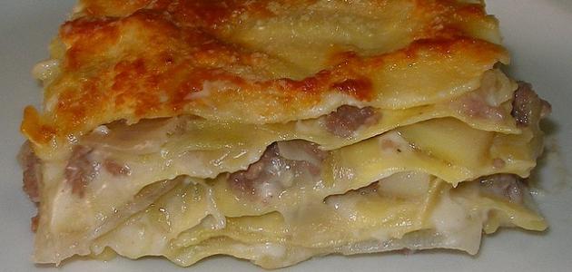 - نضع قطع العجين في الصينيّة ، بعد أن نكون قد وضعنا كميّة قليلة من الصلصة البيضاء أسفلها، ومن ثمّ كميّة من اللحم المفروم ونستمر في وضع هذه الطبقات حتى ننتهي وفي النهاية نقوم بوضع الجبنة على الوجه وندخلها الفرن.