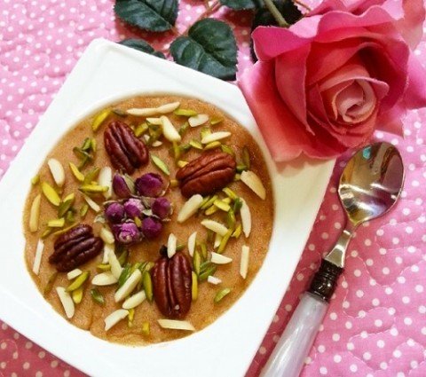 - يسكب في طبق التقديم ويزين بالمكسرات ويقدم بارد وبصحة وعافية.