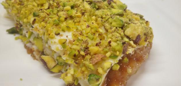 - نوزع كمية وافرة من المكسرات، والفستق الحلبي المجروش على السطح، ونشربها بالقطر البارد ثم تقدم.