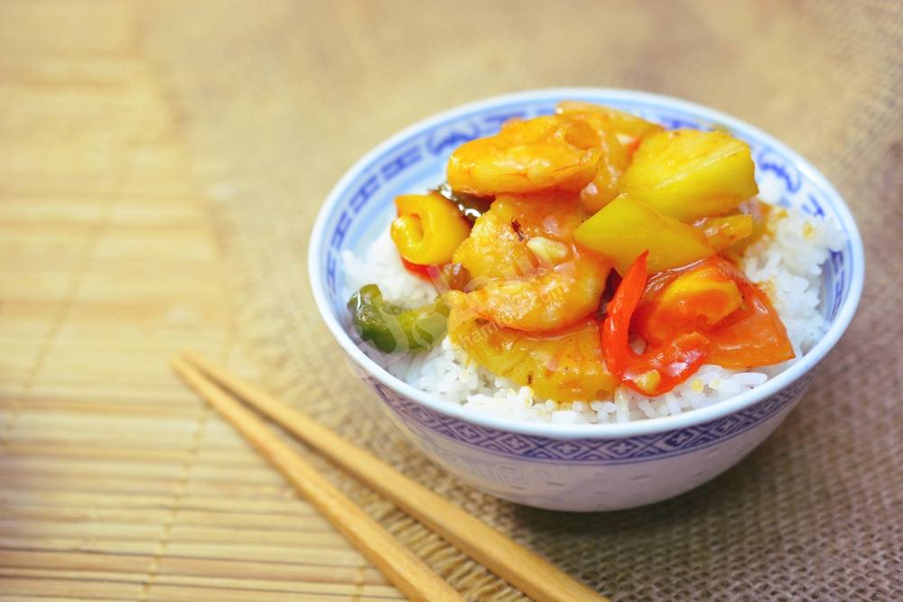 - في إناء آخر يوضع قليل من الزيت، ويضاف إليه الثوم، والزنجبيل، حتى يصبح لونه بني، ثم يضاف إليه الكاتشاب، وصلصة الطماطم، والخل، وعصير الليمون، وعصير الأناناس، وتقلب جيداً حتى يتماسك.