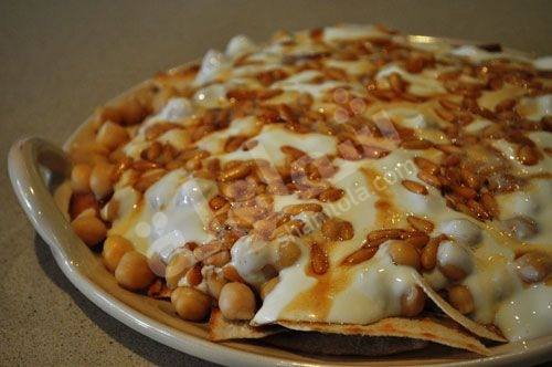 - في طبق التقديم ضعي الحمّص ثمّ فتّتي الخبز على الوجه و أخيراً إسكبي مزيج الزبادي .
